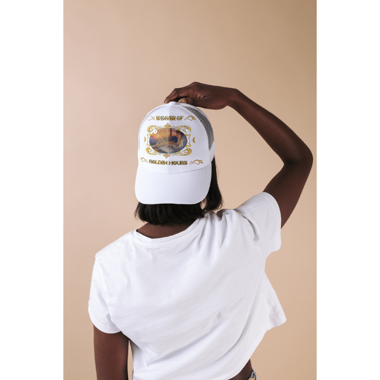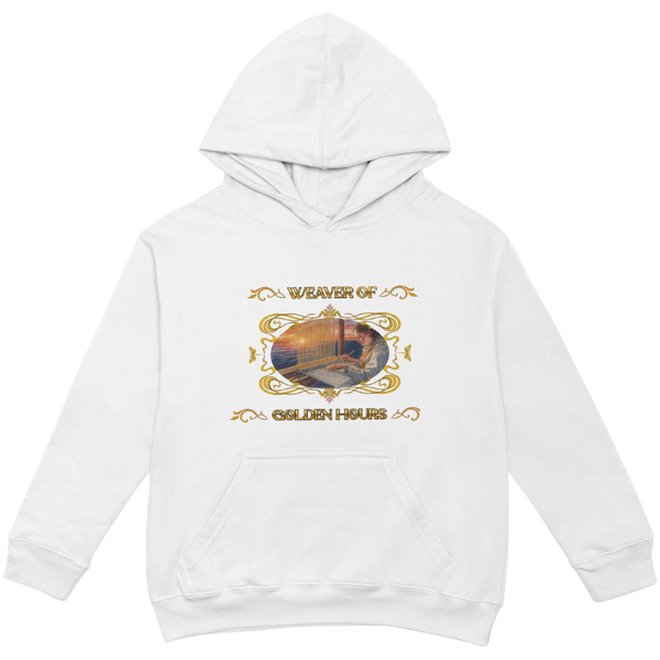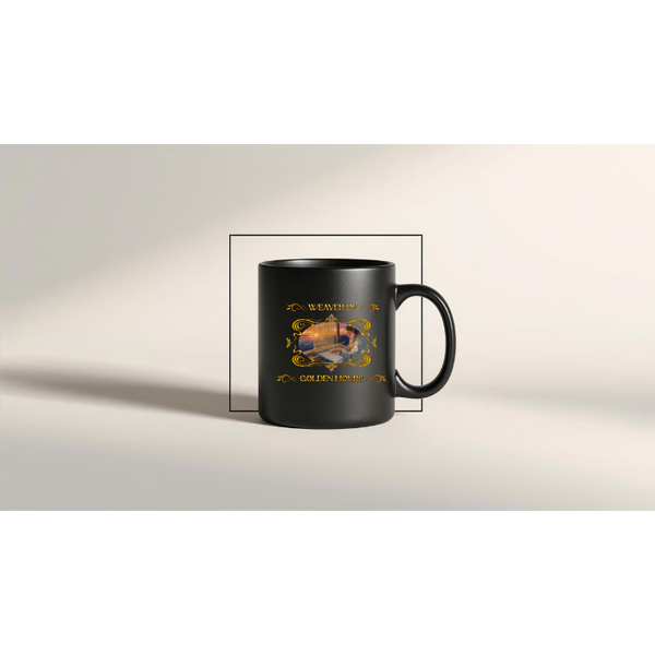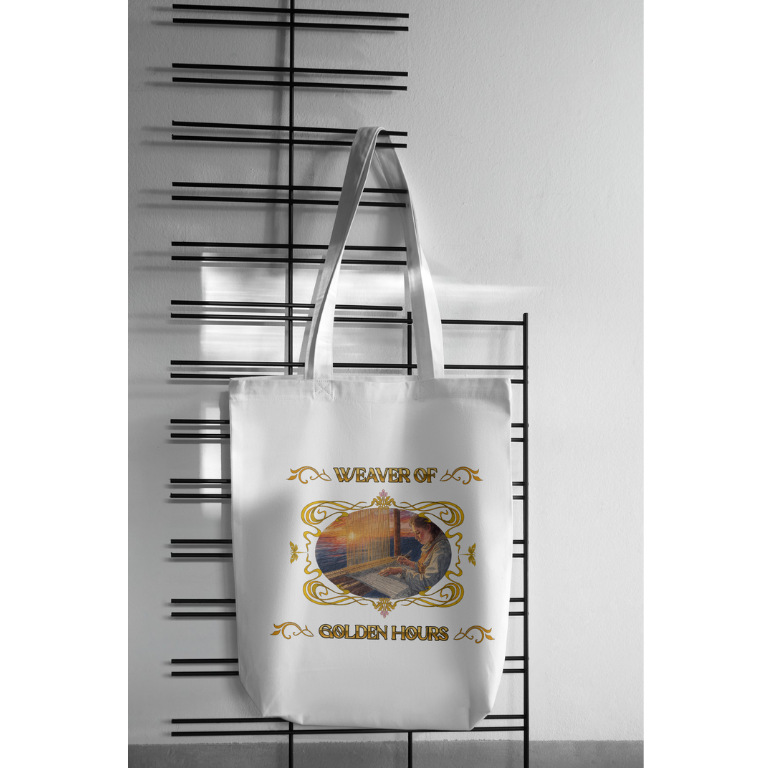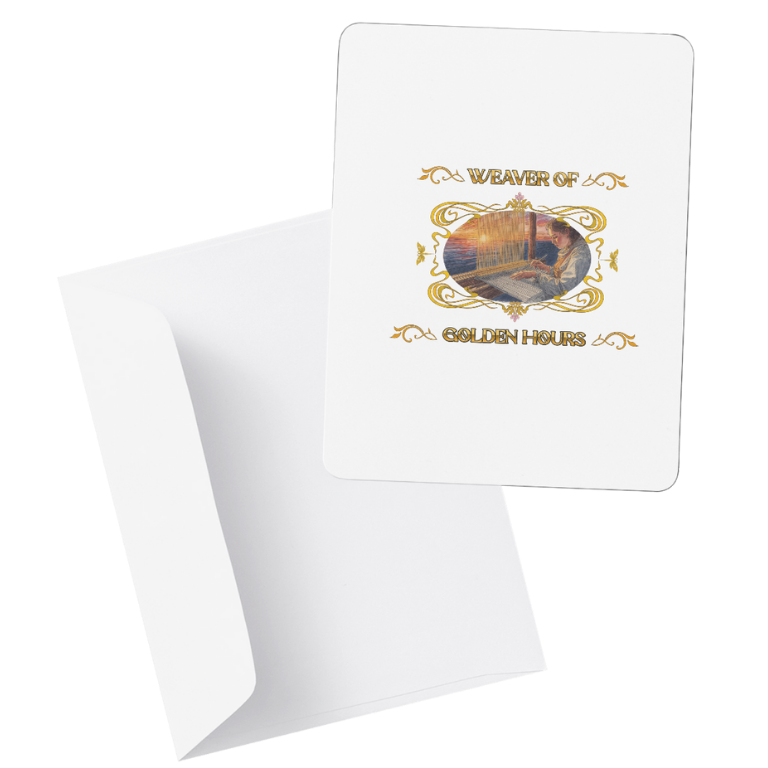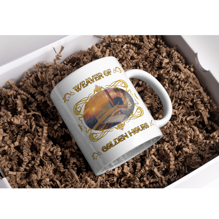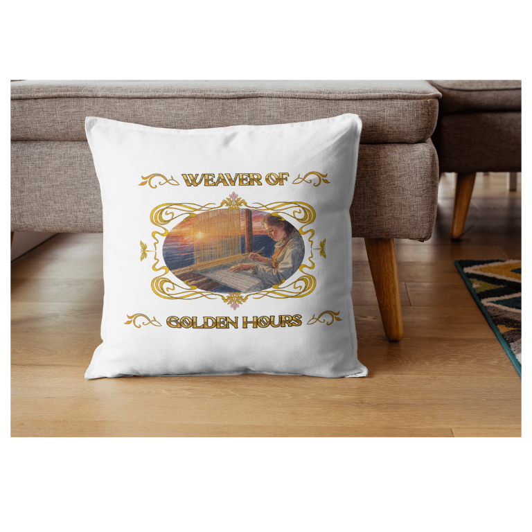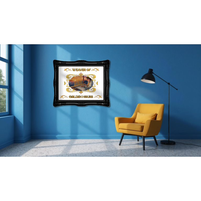 Weaver of Golden Hours captures the quiet magic of twilight, as a serene figure works the loom, threading strands of light into a tapestry of sunset. Framed in ornate golden flourishes, this artwork glows with vintage elegance and timeless grace.