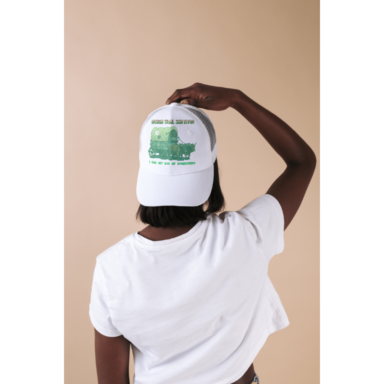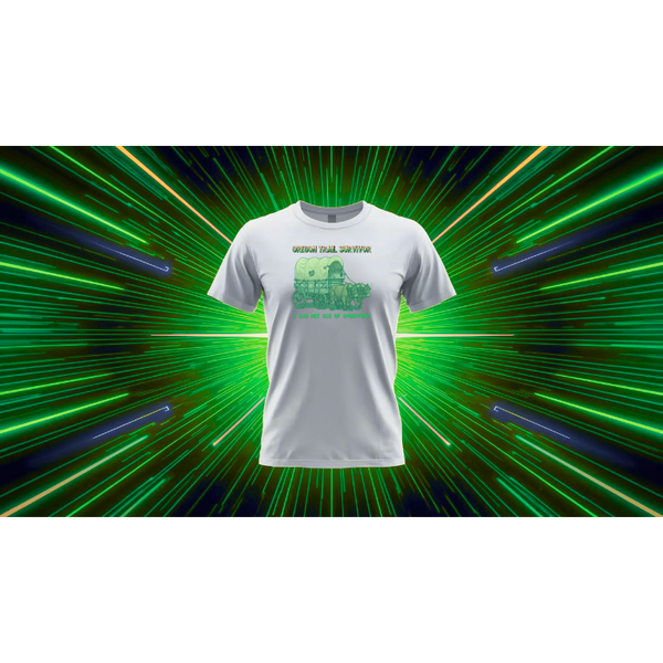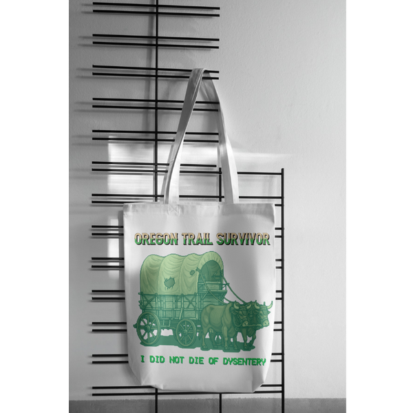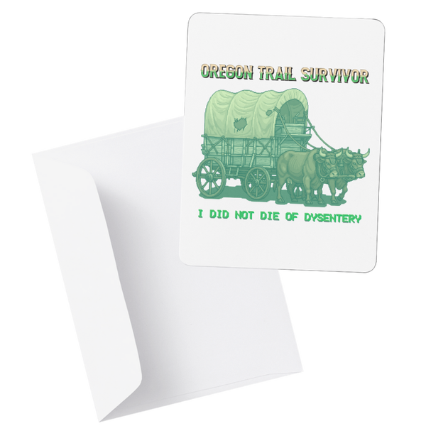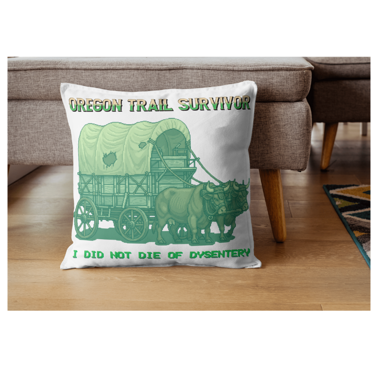 Paying tribute to the classic 1970s educational computer game The Oregon Trail, this graphic captures the nostalgic charm of early video gaming while celebrating the ultimate victory: survival.