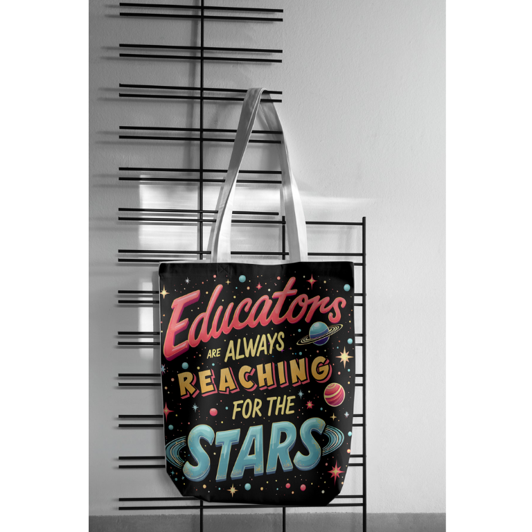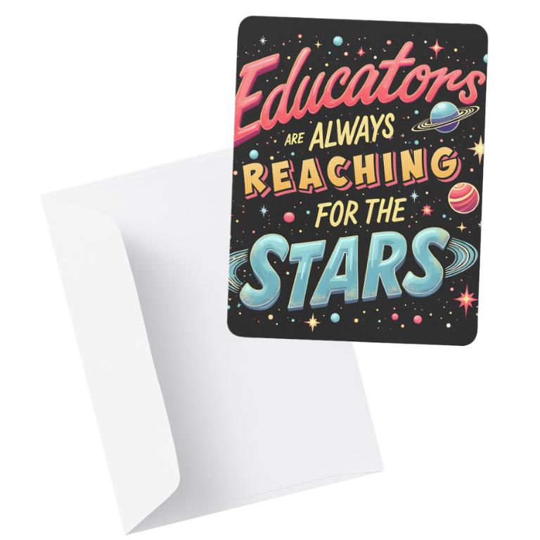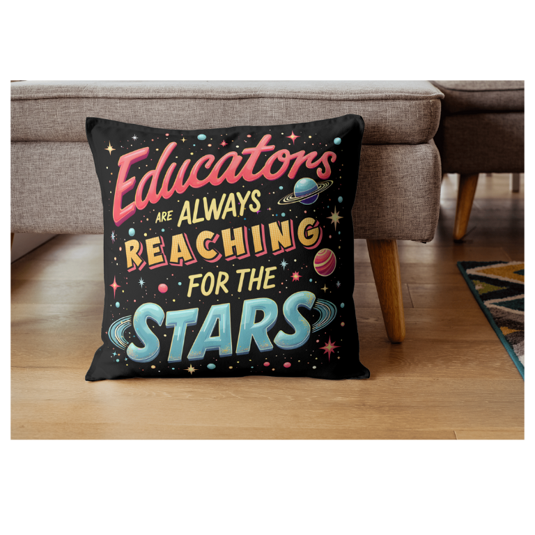 Featuring vibrant retro-style lettering surrounded by planets, stars, and cosmic bursts, the phrase “Educators Are Always Reaching For The Stars” shines with positivity and inspiration. This design is perfect for teachers, mentors, and anyone who believes in the power of guiding young minds toward limitless possibilities.
