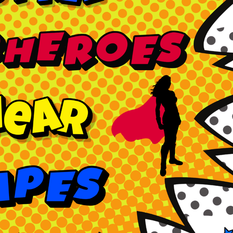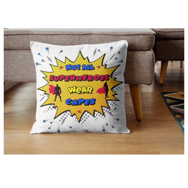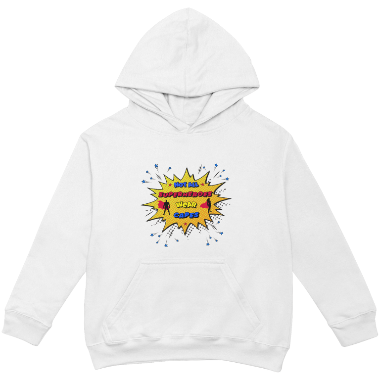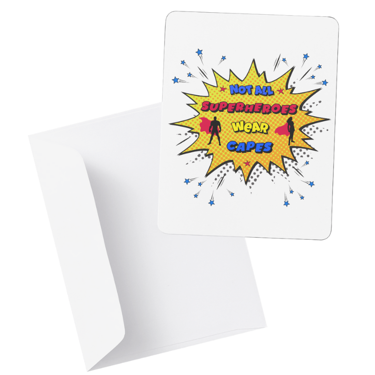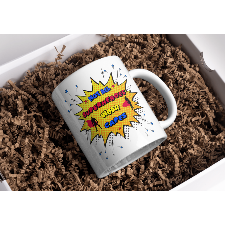 Featuring a classic comic book style with bold lettering, vibrant red, yellow, and blue accents, and explosive starburst graphics, this “Not All Superheroes Wear Capes” design is created for extra impact.