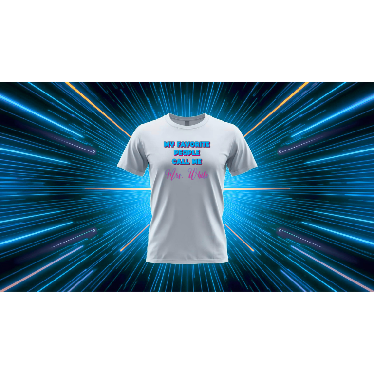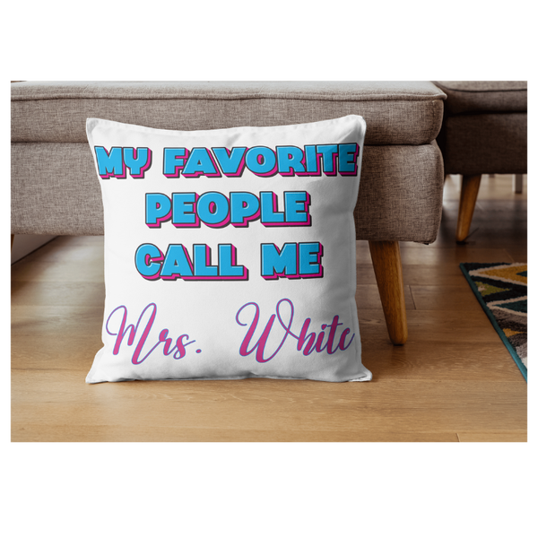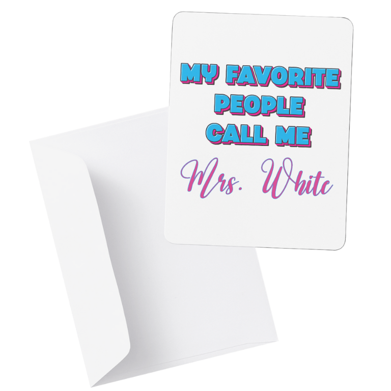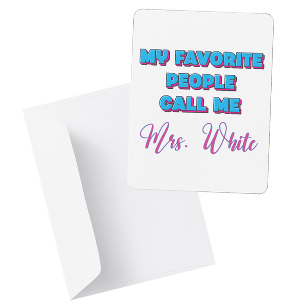 Featuring bold retro-styled block lettering in bright blue and pink with playful shadow accents, the phrase “My Favorite People Call Me [Name]” can be personalized with the teacher’s name in elegant script font.