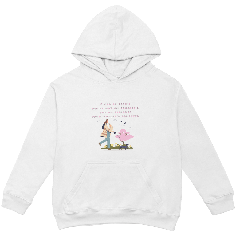 Step into a world of seasonal magic with this heartwarming design featuring the poetic phrase: “A dog in spring walks not on blossoms, but on applause from nature’s confetti.”