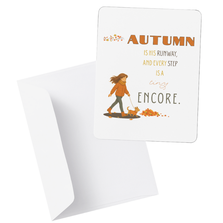 Celebrate the elegance and delight of autumn walks with this enchanting design set, featuring two gender-selectable versions of the phrase: “Autumn is his runway, and every step is a tiny encore.” or “Autumn is her runway, and every step is a tiny encore.”