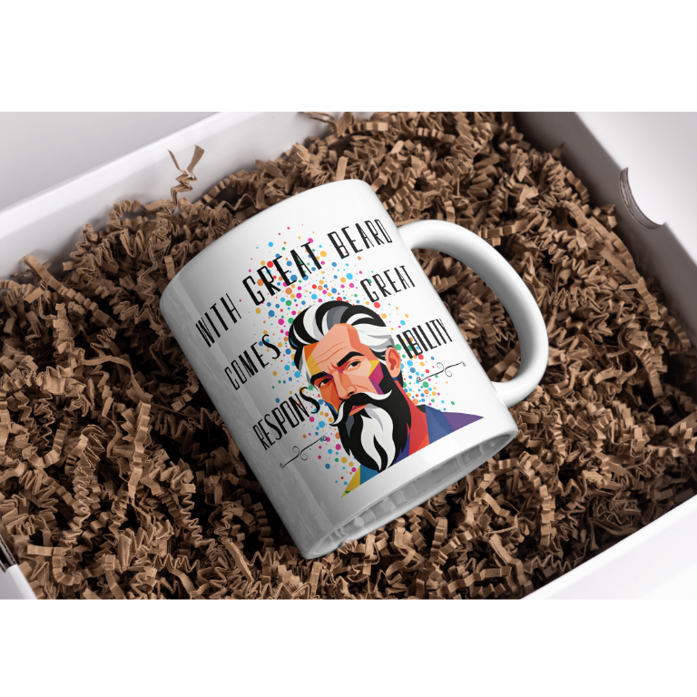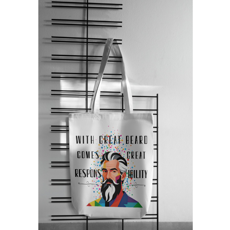 Celebrate the art of facial hair with “With Great Beard”, a bold and colorful digital design featuring the witty phrase: “With great beard comes great responsibility.”